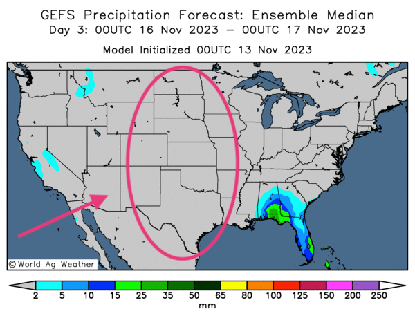 - Cette carte US, fournie par World Ag Weather et dessinée pour les 3 prochains jours, ne montre pas de possibilités de pluie pour les Plaines US.
