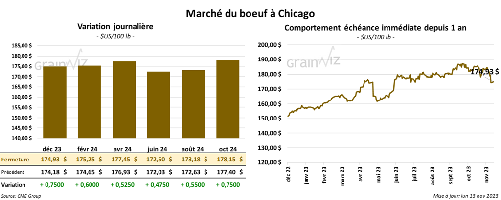 Le contrat de bœuf US déc. 23 a clôturé à 174,93 $ (+ 75 cents). Celui févr. 24 a fermé à 175,25 $ (+ 60 cents). Celui avr. 24 a terminé à 177,45 $ (+ 53 cents). Quant au veau US, le contrat nov. 23 a fini à 230,72 $ (+ 1,00 $). Celui janv. 24 a clôturé à 228,30 $ (+ 1,88 $). Celui mars 24 a fermé à 230,07 $ (+ 1,45 $).