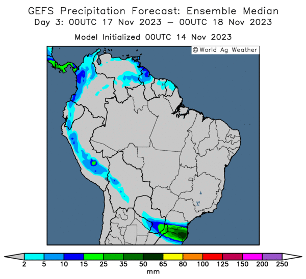 Cette carte du Brésil, fournie par World Ag Weather et dessinée pour les 3 prochains jours, montre une absence de précipitation à l’ensemble du territoire. L’exception est l’extrême sud du Brésil qui pourrait avoir des pluies abondantes.