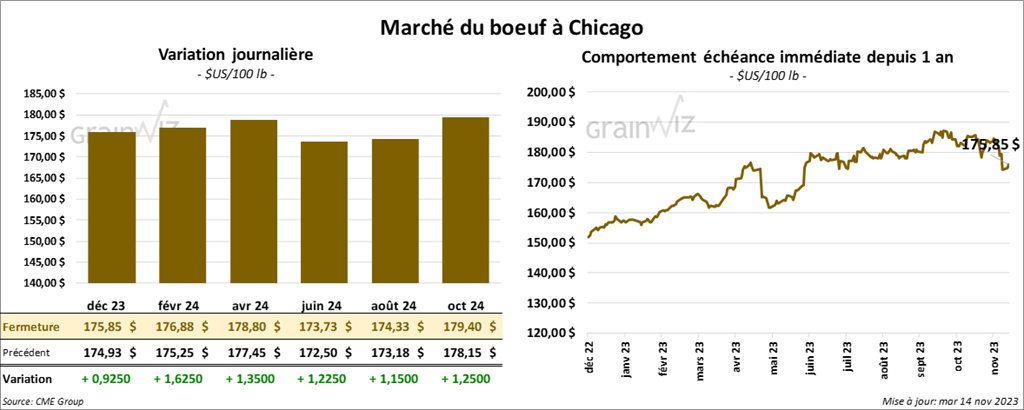 Le contrat de bœuf US déc. 23 a clôturé à 175,85 $ (+ 93 cents). Celui févr. 24 a fermé à 176,88 $ (+ 1,63 $). Celui avr. 24 a terminé à 178,80 $ (+ 1,35 $). Quant au veau US, le contrat nov. 23 a fini à 230,05 $ (- 68 cents). Celui janv. 24 a clôturé à 229,00 $ (+ 70 cents). Celui mars 24 a fermé à 231,38 $ (+ 1,30 $).