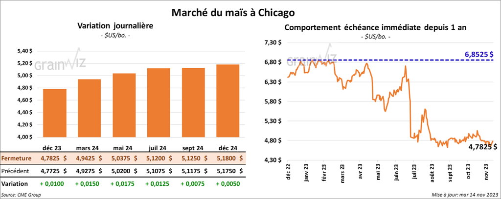 Le contrat de maïs US déc. 23 a clôturé à 4,7825 $ (+ 1 cent). Celui mars 24 a fermé à 4,9425 $ (+ 1 ½ cent). Celui mai 24 a terminé à 5,0375 $ (+ 1 ¾ cent).
