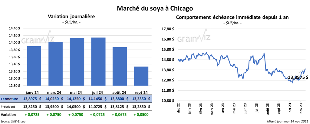 Le contrat de soya US janv. 24 a clôturé à 13,8975 $ (+ 7 ¼ cents). Celui mars 24 a fermé à 14,0250 $ (+ 7 ½ cents). Celui mai 24 a terminé à 14,1250 $ (+ 7 ½ cents). Quant au tourteau de soya US, le contrat déc. 23 a fini à 473,60 $/tonne (+ 4,50 $/tonne). Celui janv. 24 a clôturé à 455,60 $/tonne (+ 1,80 $/tonne). Celui mars 24 a fermé à 440,90 $/tonne (+ 80 cents/tonne). Du côté de l’huile de soya US, le contrat déc. 23 a terminé à 52,75 $ (+ 121 points). Celui janv. 24 a fini à 51,96 $ (+ 126 points).