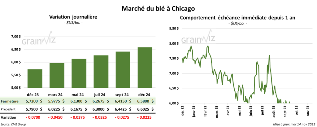 À Chicago, le contrat de blé déc. 23 a clôturé à 5,7200 $ (- 7 cents). Celui mars 24 a fermé à 5,9775 $ (- 4 ½ cents). Celui mai 24 a terminé à 6,1300 $ (- 3 ¾ cents). À Kansas, le contrat de blé dur rouge déc. 23 a fini à 6,3960 $ (- 1 ¾ cent). Celui mars 24 a clôturé à 6,4940 $ (- 2 ½ cents). Celui mai 24 a fermé à 6,5640 $ (- 2 cents). À Minneapolis, le contrat de blé de printemps déc. 23 a terminé à 7,3450 $ (+ 5 ¾ cents). Celui mars 24 a fini à 7,4725 $ (+ 3 ¼ cents). Celui mai 24 a clôturé à 7,5575 $ (+ 3 cents).