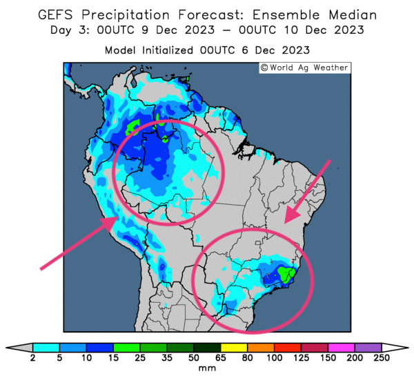 - Cette carte du Brésil, fournie par World Ag Weather et dessinée pour les 3 prochains jours, montre des possibilités d’averses seulement pour certaines parties de l’ouest et du sud-est du Brésil.