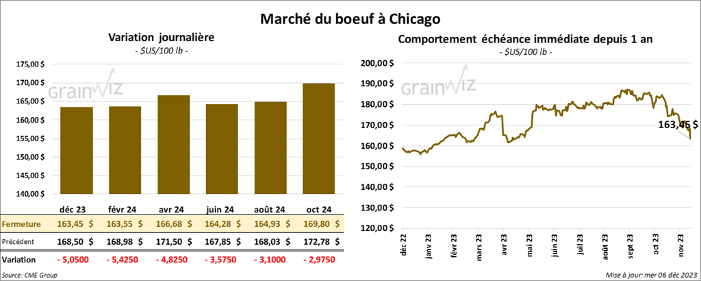 Le contrat de bœuf US déc. 23 a clôturé à 163,45 $ (- 5,05 $). Celui févr. 24 a fermé à 163,55 $ (- 5,43 $). Celui avr. 24 a terminé à 166,68 $ (- 4,83 $). Quant au veau US, le contrat janv. 24 a fini à 210,15 $ (- 4,55 $). Celui mars 24 a clôturé à 211,75 $ (- 5,72 $). Celui avr. 24 a fini à 215,65 $ (- 5,72 $).