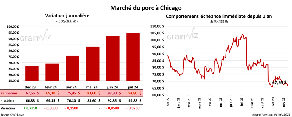 Le contrat de porc US déc. 23 a clôturé à 67,55 $ (+ 73 cents). Celui févr. 24 a fermé à 69,30 $ (- 5 cents). Celui avr. 24 a terminé à 75,95 $ (- 15 cents).