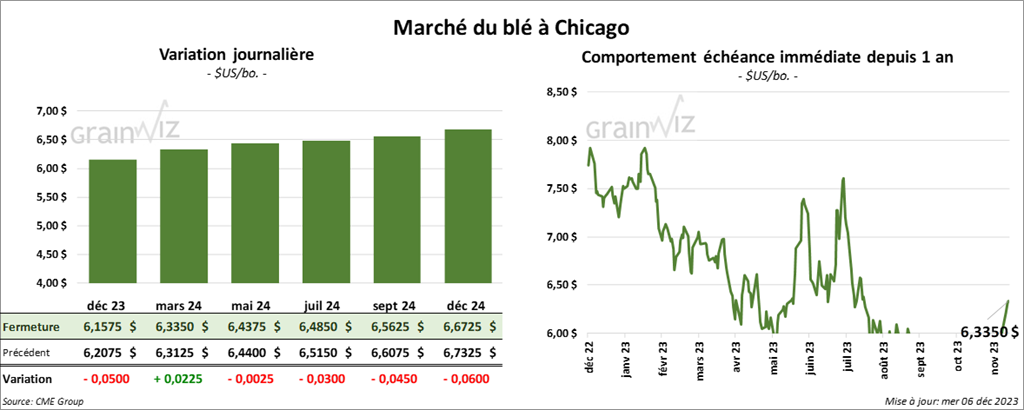 À Chicago, le contrat de blé déc. 23 a clôturé à 6,1575 $ (- 5 cents). Celui mars 24 a fermé à 6,3350 $ (+ 2 ¼ cents). Celui mai 24 a terminé à 6,4375 (- ¼ cent). À Kansas, le contrat de blé dur rouge déc. 23 a fini à 6,5060 $ (- 6 ¾ cents). Celui mars 24 a clôturé à 6,5600 $ (- 6 ¾ cents). Celui mai 24 a fermé à 6,5940 $ (- 7 ¼ cents). À Minneapolis, le contrat de blé de printemps déc. 23 a terminé à 7,0700 $ (- 8 cents). Celui mars 24 a fini à 7,3050 $ (- 8 ½ cents). Celui mai 24 a clôturé à 7,4100 $ (- 8 ½ cents).