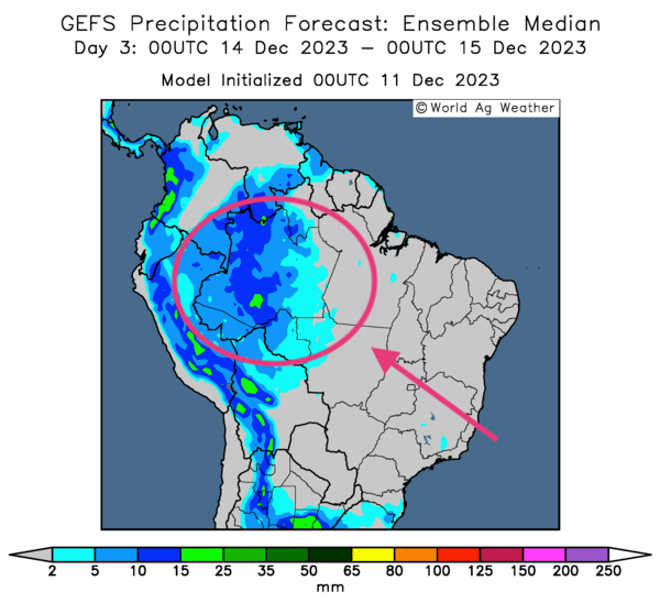 - Cette carte du Brésil, fournie par World Ag Weather et dessinée pour les 3 prochains jours, montre notamment que les averses pourraient se concentrer dans l’ouest du Brésil.