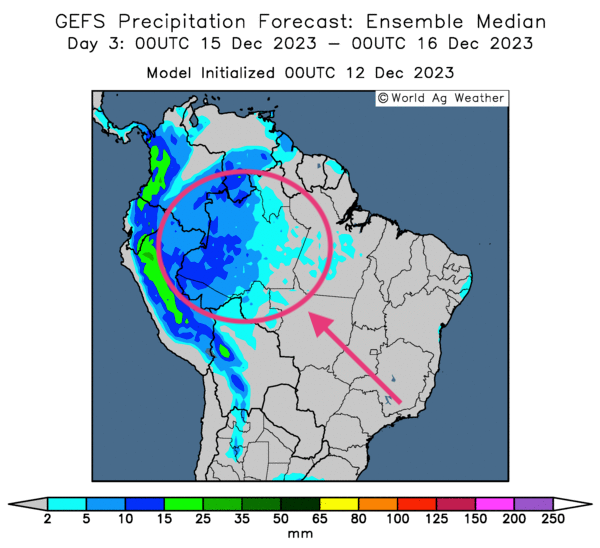 - Cette carte du Brésil, fournie par World Ag Weather et dessinée pour les 3 prochains jours, montre notamment des possibilités d’averses dans l’ouest du Brésil.