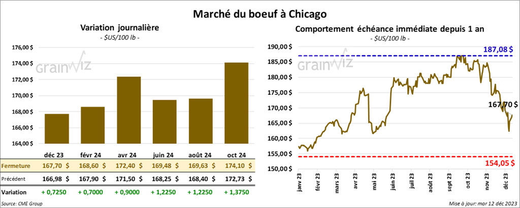 Le contrat de bœuf US déc. 23 a clôturé à 167,70 $ (+ 73 cents). Celui févr. 24 a fermé à 168,60 $ (+ 70 cents). Celui avr. 24 a terminé à 172,40 $ (+ 90 cents). Quant au veau US, le contrat janv. 24 a fini à 219,25 $ (+ 1,30 $). Celui mars 24 a clôturé à 219,60 $ (+ 1,00 $). Celui avr. 24 a fermé à 223,35 $ (+ 1,35 $).