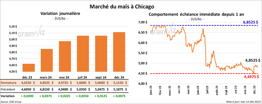 Le contrat de maïs US déc. 23 a clôturé à 4,6250 $ (+ 2 cents). Celui mars 24 a fermé à 4,8525 $ (+ 3 ¾ cents). Celui mai 24 a terminé à 4,9725 $ (+ 3 ¼ cents).