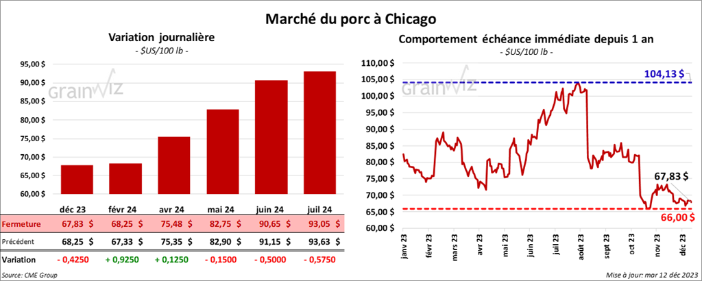 Le contrat de porc US déc. 23 a clôturé à 67,83 $ (- 43 cents). Celui févr. 24 a fermé à 68,25 $ (+ 93 cents). Celui avr. 24 a terminé à 75,48 $ (+ 13 cents).
