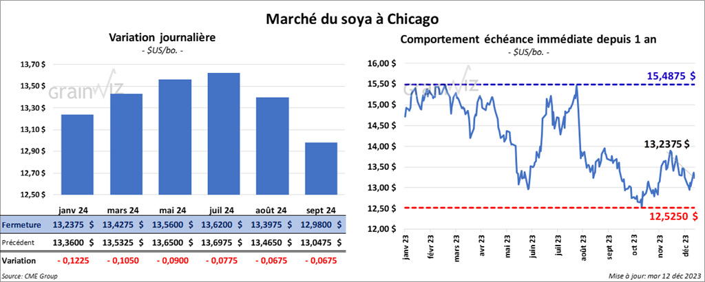 Le contrat de soya US janv. 24 a clôturé à 13,2375 $ (- 12 ¼ cents). Celui mars 24 a fermé à 13,4275 $ (- 10 ½ cents). Celui mai 24 a terminé à 13,5600 $ (- 9 cents). Quant au tourteau de soya US, le contrat déc. 23 a fini à 429,20 $/tonne (- 1,50 $/tonne). Celui janv. 24 a clôturé à 410,30 $/tonne (- 2,90 $/tonne). Celui mars 24 a fermé à 401,60 $/tonne (- 3,00 $/tonne). Du côté de l’huile de soya US, le contrat déc. 23 a terminé à 50,39 $ (- 67 points). Celui janv. 24 a fini à 50,42 $ (- 69 points).