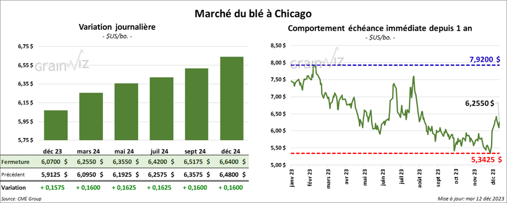 À Chicago, le contrat de blé déc. 23 a clôturé à 6,0700 $ (+ 15 ¾ cents). Celui mars 24 a fermé à 6,2550 $ (+ 16 cents). Celui mai 24 a terminé à 6,3550 $ (+ 16 ¼ cents). À Kansas, le contrat de blé dur rouge déc. 23 a fini à 6,5140 $ (+ 24 ½ cents). Celui mars 24 a clôturé à 6,5660 $ (+ 24 ½ cents). Celui mai 24 a fermé à 6,6020 $ (+ 23 ¼ cents). À Minneapolis, le contrat de blé de printemps déc. 23 a terminé à 7,0025 $ (- 12 ½ cents). Celui mars 24 a fini à 7,2950 $ (+ 17 ¾ cents). Celui mai 24 a clôturé à 7,3825 $ (+ 17 ¾ cents).