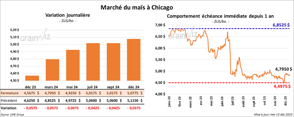 Le contrat de maïs US a clôturé à 4,5675 $ (- 5 ¾ cents). Celui mars 24 a fermé à 4,7950 $ (- 5 ¾ cents). Celui mai 24 a terminé à 4,9250 $ (- 4 ¾ cents).
