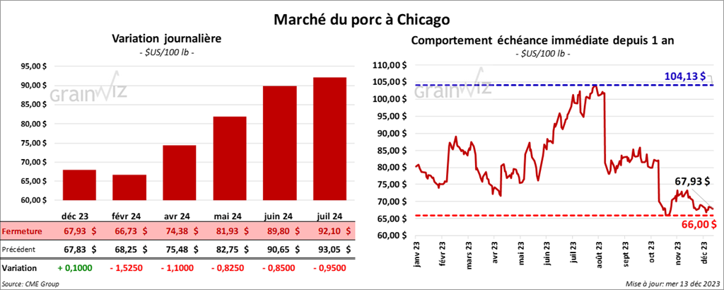 Le contrat de porc US déc. 23 a clôturé à 67,93 $ (+ 10 cents). Celui févr. 24 a fermé à 66,73 $ (- 1,53 $). Celui avr. 24 a terminé à 74,38 $ (- 1,10 $).