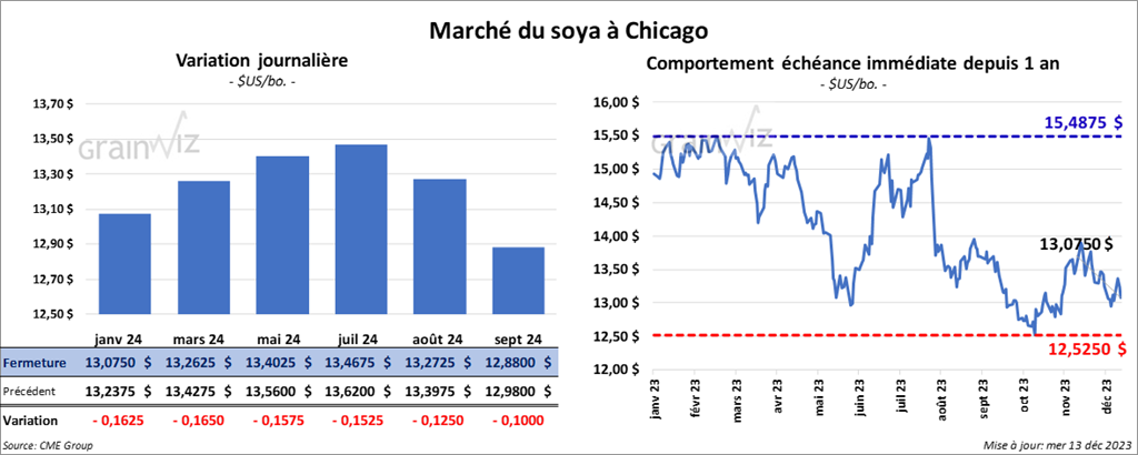 Le contrat de soya US janv. 24 a clôturé à 13,0750 $ (- 16 ¼ cents). Celui mars 24 a fermé à 13,2625 $ (- 16 ½ cents). Celui mai 24 a terminé à 13,4025 $ (- 15 ¾ cents). Quant au tourteau de soya US, le contrat déc. 23 a fini à 421,10 $/tonne (- 8,10 $/tonne). Celui janv. 24 a clôturé à 402,20 $/tonne (- 8,10 $/tonne). Celui mars 24 a fermé à 393,60 $/tonne (- 8,00 $/tonne). Du côté de l’huile de soya US, le contrat déc. 23 a terminé à 49,82 $ (- 57 points). Celui janv. 24 a fini à 49,83 $ (- 59 points).