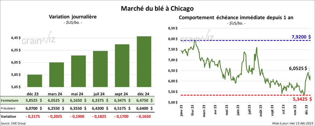 À Chicago, le contrat de blé déc. 23 a clôturé à 5,8575 $ (- 21 ¾ cents). Celui mars 24 a fermé à 6,0525 $ (- 20 ¼ cents). Celui mai 24 a terminé à 6,1650 $ (- 19 cents). À Kansas, le contrat de blé dur rouge a fini à 6,2660 $ (- 24 ¾ cents). Celui mars 24 a clôturé à 6,3200 $ (- 24 ¾ cents). Celui mai 24 a fermé à 6,3700 $ (- 23 ¼ cents). À Minneapolis, le contrat déc. 23 a terminé à 7,0025 $ (0,0). Celui mars 24 a fini à 7,1350 $ (- 16 cents). Celui mai 24 a clôturé à 7,2275 $ (- 15 ½ cents).