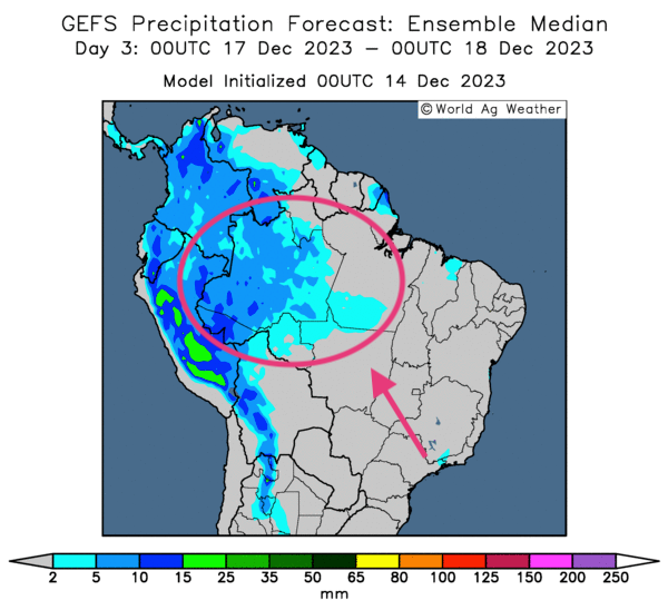 - Cette carte du Brésil, fournie par World Ag Weatheret et dessinée pour les 3 prochains jours, montre toujours une concentration des averses possibles dans l’ouest du Brésil. Dans le nord, le centre et le sud les conditions resteront probablement sèches.