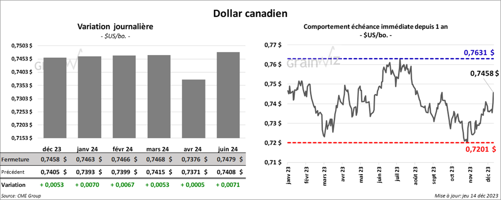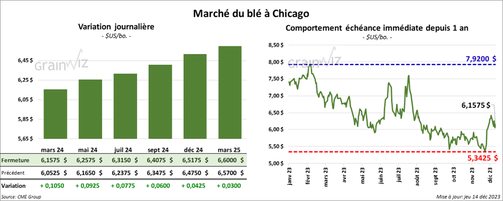 À Chicago, le contrat de blé mars 24 a clôturé à 6,1575 $ (+ 10 ½ cents). Celui mai 24 a fermé à 6,2575 $ (+ 9 ¼ cents). Celui juil. 24 a terminé à 6,3150 $ (+ 7 ¾ cents). À Kansas, le contrat de blé dur rouge déc. 23 a fini à 6,2660 $ (0,0). Celui mars 24 a clôturé à 6,3640 $ (+ 4 ½ cents). Celui mai 24 a fermé à 6,4040 $ (+ 3 ½ cents). À Minneapolis, le contrat de blé de printemps mars 24 a terminé à 7,1725 $ (+ 3 ¾ cents). Celui mai 24 a fini à 7,2675 $ (+ 4 cents). Celui juil. 24 a clôturé à 7,3425 $ (+ 3 ¾ cents).