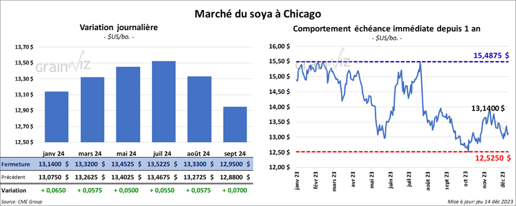 Le contrat de soya US janv. 24 a clôturé à 13,1400 $ (+ 6 ½ cents). Celui mars 24 a fermé à 13,32 $ (+ 5 ¾ cents). Celui mai 24 a terminé à 13,4525 $ (- 5 cents). Quant au tourteau de soya US, le contrat janv. 24 a fini à 403,70 $/tonne (+ 1,50 $/tonne). Celui mars 24 a clôturé à 395,80 $/tonne (+ 2,20 $/tonne). Celui mai 24 a fermé à 394,20 $/tonne (+ 1,60 $/tonne). Du côté de l’huile de soya US, le contrat déc. 23 a terminé à 49,28 $ (- 54 points). Celui janv. 24 a fini à 49,51 $ (- 32 points).