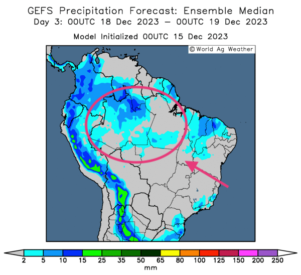 - Cette carte du Brésil, fournie par World Ag Weather et dessinée pour les 3 prochains jours, montre notamment des possibilités de pluies légères pour l’ouest et quelques parties du centre du Brésil.