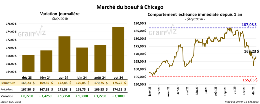 Le contrat de bœuf US déc. 23 a clôturé à 168,23 $ (+ 73 cents). Celui févr. 24 a fermé à 169,35 $ (+ 1,43 $). Celui avr. 24 a terminé à 172,85 $ (+ 1,28 $). Quant au veau US, le contrat janv. 24 a fini à 220,90 $ (+ 1,55 $). Celui mars 24 a clôturé à 222,18 $ (+ 2,05 $). Celui avr. 24 a fermé à 226,57 $ (+ 2,25 $).