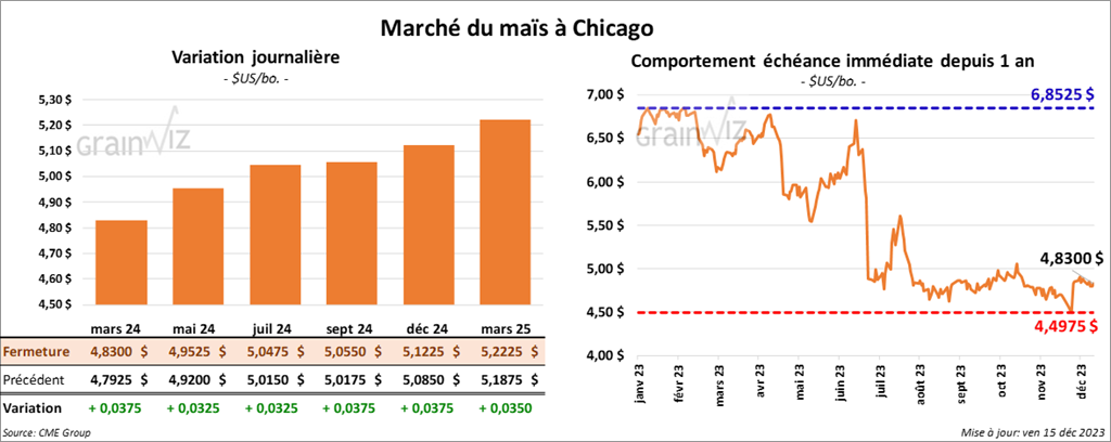 Le contrat de maïs US mars 24 a clôturé à 4,8300 $ (+ 3 ¾ cents). Celui mai 24 a fermé à 4,9525 $ (+ 3 ¼ cents). Celui juil. 24 a terminé à 5,0475 $ (+ 3 ¼ cents).