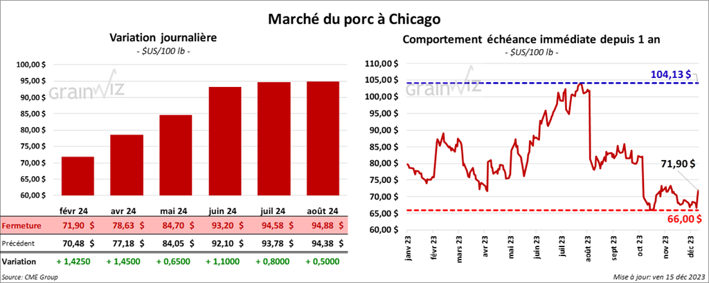Le contrat de porc US févr. 24 a clôturé à 71,90 $ (+ 1,43 $). Celui avr. 24 a fermé à 78,63 $ (+ 1,45 $). Celui mai 24 a terminé à 84,70 $ (+ 65 cents).