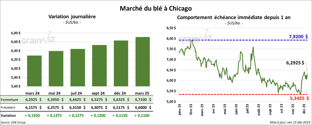 À Chicago, le contrat de blé US mars 24 a clôturé à 6,2925 $ (+ 13 ½ cents). Celui mai 24 a fermé à 6,3950 $ (+ 13 ¾ cents). Celui juil. 24 a terminé à 6,4425 $ (+ 12 ¾ cents). À Kansas, le contrat de blé dur rouge mars 24 a fini à 6,4260 $ (+ 6 ¼ cents). Celui mai 24 a clôturé à 6,4740 $ (+ 7 cents). Celui juil. 24 a fermé à 6,5160 $ (+ 8 cents). À Minneapolis, le contrat de blé de printemps mars 24 a terminé à 7,3075 $ (+ 13 ½ cents). Celui mai 24 a fini à 7,3950 $ (+ 12 ¾ cents). Celui juil. 24 a clôturé à 7,4550 $ (+ 11 ¼ cents).
