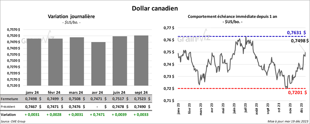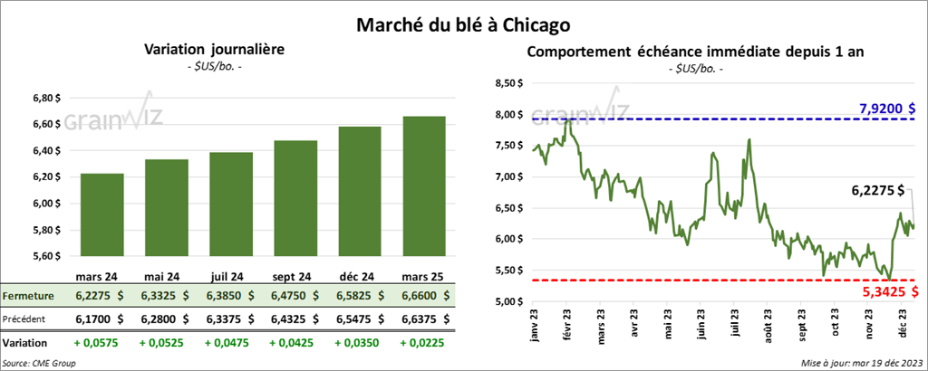 À Chicago, le contrat de blé mars 24 a clôturé à 6,2275 $ (+ 5 ¾ cents). Celui mai 24 a fermé à 6,3325 $ (+ 5 ¼ cents). Celui juil. 24 a terminé à 6,3850 $ (+ 4 ¾ cents). À Kansas, le contrat de blé dur rouge mars 24 a fini à 6,4140 $ (+ 13 ¾ cents). Celui mai 24 a clôturé à 6,4520 $ (+ 12 ½ cents). Celui juil. 24 a fermé à 6,4840 $ (+ 10 ¾ cents). À Minneapolis, le contrat de blé de printemps mars 24 a terminé à 7,2825 $ (+ 6 ¾ cents). Celui mai 24 a fini à 7,3650 $ (+ 5 ½ cents). Celui juil. 24 a clôturé à 7,4400 $ (+ 5 ½ cents).
