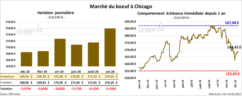 Le contrat de bœuf US déc. 23 a clôturé à 168,45 $ (- 38 cents). Celui févr. 24 a fermé à 168,78 $ (- 85 cents). Celui avr. 24 a terminé à 172,68 $ (- 83 cents). Quant au veau US, le contrat janv. 24 a fini à 221,90 $ (- 1,27 $). Celui mars 24 a clôturé à 223,20 $ (- 95 cents). Celui avr. 24 a fermé à 227,88 $ (- 75 cents).