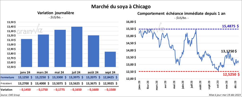 Le contrat de soya US janv. 24 a clôturé à 13,1250 $ (- 14 ½ cents). Celui mars 24 a fermé à 13,2250 $ (- 17 ½ cents). Celui mai 24 a terminé à 13,3300 $ (- 17 ¾ cents). Quant au tourteau de soya US, le contrat janv. 24 a fini à 403,20 $/tonne (- 9,50 $/tonne). Celui mars 24 a clôturé à 392,40 $/tonne (- 9,00 $/tonne). Celui mai 24 a fermé à 388,70 $/tonne (- 8,20 $/tonne). Dans le cas de l’huile de soya US, le contrat janv. 24 a terminé à 50,73 $ (+ 9 points). Celui mars 24 a fini à 50,84 $ (+ 10 points).
