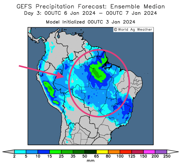 - Cette carte du Brésil, fournie par World Ag Weather et dessinée pour les 3 prochains jours, montre notamment des possibilités d’averses dans le centre et le nord du Brésil.
