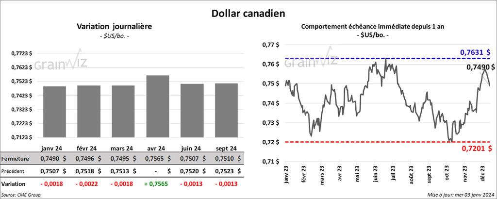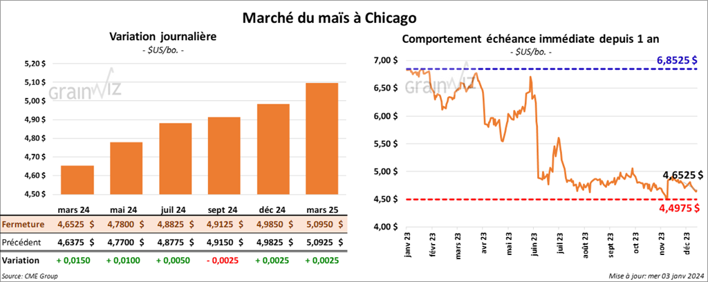 Le contrat de maïs US mars 24 a clôturé à 4,6525 $ (+ 1 ½ cent). Celui mai 24 a fermé à 4,7800 $ (+ 1 cent). Celui juil. 24 a terminé à 4,8825 $ (+ ½ cent).