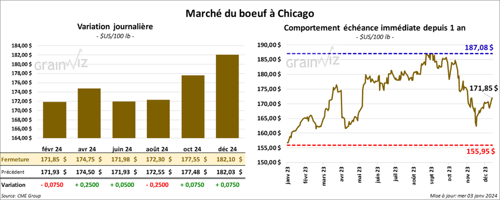 Le contrat de bœuf US févr. 24 a clôturé à 171,85 $ (- 8 cents). Celui avr. 24 a fermé à 174,75 $ (+ 25 cents). Celui juin 24 a terminé à 171,98 $ (+ 5 cents). Quant au veau US, le contrat janv. 24 a fini à 226,07 $ (+ 65 cents). Celui mars 24 a clôturé à 227,03 $ (+ 57 cents). Celui avr. 24 a fermé à 232,55 $ (+ 40 cents).