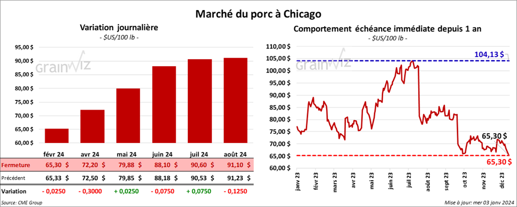 Le contrat de porc US févr. 24 a clôturé à 65,30 $ (- 3 cents). Celui avr. 24 a fermé à 72,20 $ (- 30 cents). Celui mai 24 a terminé à 79,88 $ (+ 3 cents).