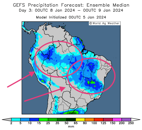 - Placée ci-dessous, cette carte du Brésil, fournie par World Ag Weather et dessinée pour les 3 prochains jours, montre notamment des averses possibles dans l’ouest, le centre, le nord et certaines parties de l’est. Par ailleurs, l’analyse des autres cartes du Brésil, toujours présentées par le même organisme, indique que l’essentiel des précipitations pourrait se poursuivre au cours des jours suivants, sans doute avec une intensité variable pour la plupart des régions. À noter que le sud du Brésil reste, et sera probablement épargné par cette météo pluvieuse.
