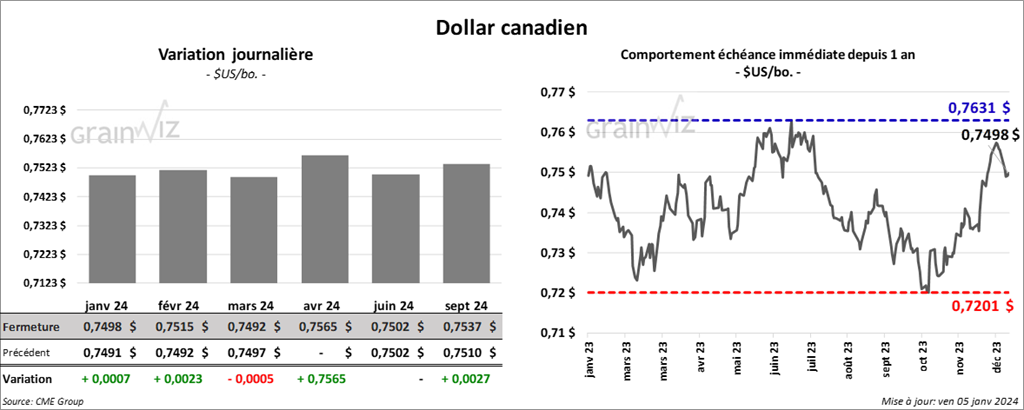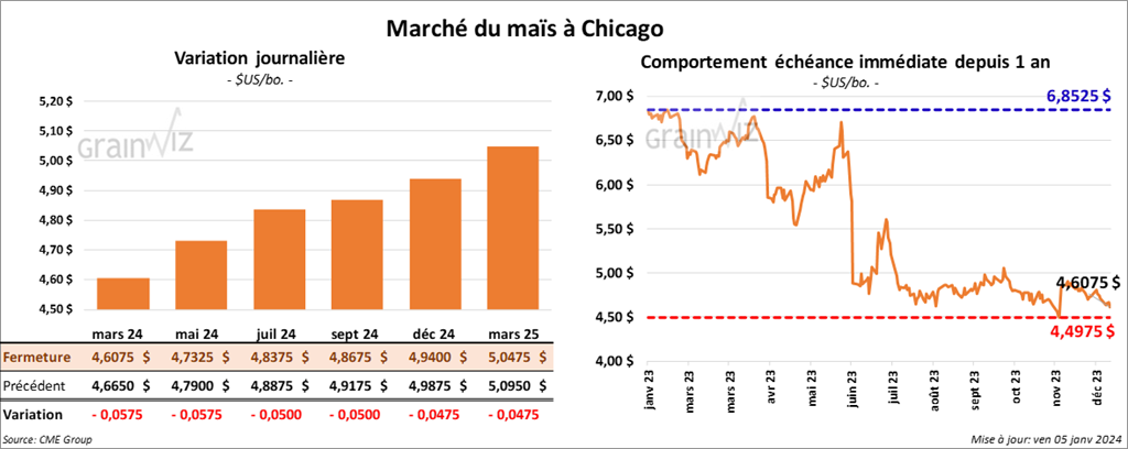 Le contrat de maïs US mars 24 a clôturé à 4,6075 $ (- 5 ¾ cents). Celui mai 24 a fermé à 4,7325 $ (- 5 ¾ cents). Celui juil. 24 a terminé à 4,8375 $ (- 5 cents).
