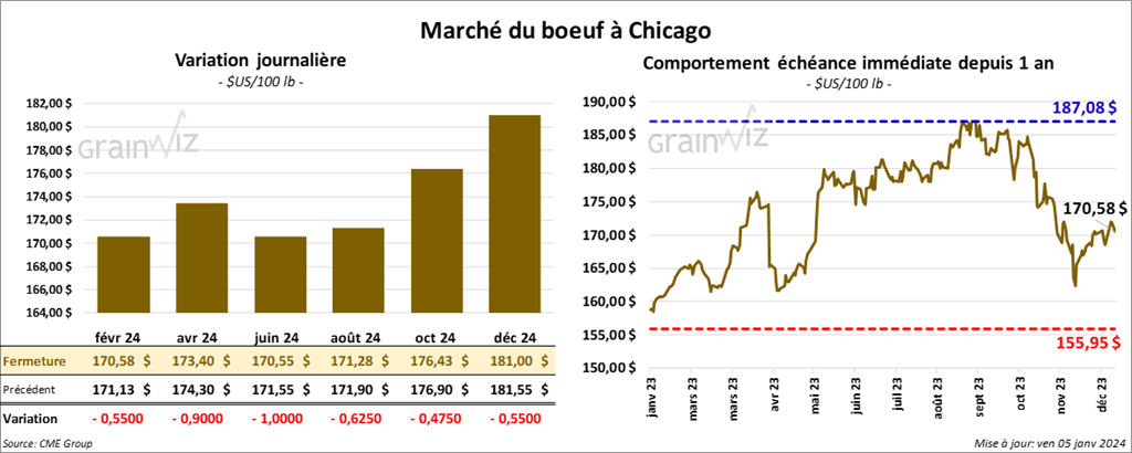 Le contrat de bœuf US févr. 24 a clôturé à 170,58 $ (- 55 cents). Celui avr. 24 a fermé à 173,40 $ (- 90 cents). Celui juin 24 a terminé à 170,55 $ (- 1,00 $). Quant au veau US, le contrat janv. 24 a fini à 223,13 $ (- 1,55 $). Celui mars 24 a clôturé à 224,15 $ (- 1,50 $). Celui avr. 24 a fermé à 229,78 $ (- 1,50 $).