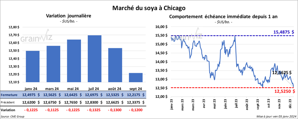 Le contrat de soya US janv. 24 a clôturé à 12,4975 $ (- 12 ¼ cents). Celui mars 24 a fermé à 12,5625 $ (- 11 ¼ cents). Celui mai 24 a terminé à 12,6425 $ (- 12 ¼ cents). Quant au tourteau de soya US, le contrat janv. 24 a fini à 388,60 $/tonne (- 12,60 $/tonne). Celui mars 24 a clôturé à 369,40 $/tonne (- 6,80 $/tonne). Celui mai 24 a fermé à 370,70 $/tonne (- 5,70 $/tonne). Du côté de l’huile de soya US, le contrat janv. 24 a terminé à 47,17 $ (- 71 points). Celui mars 24 a fini à 47,63 $ (- 53 points).