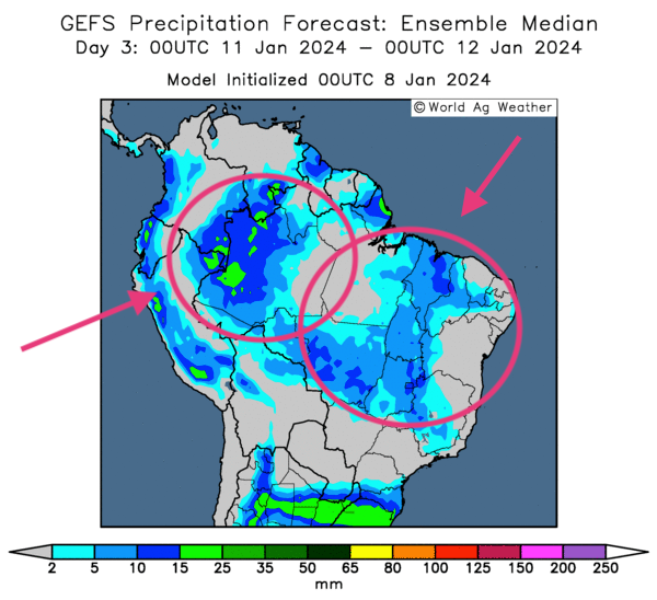- Pour la semaine, des météorologues anticipent toujours des précipitations bénéfiques pour la plupart des secteurs du centre du Brésil. À plus long terme, toutefois, peut-être au cours de la semaine prochaine, ils croient que dans cette région, les conditions pourraient redevenir plus sèches.