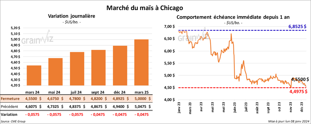 Le contrat de maïs US mars 24 a clôturé à 4,5500 $ (- 5 ¾ cents). Celui mai 24 a fermé à 4,6750 $ (- 5 ¾ cents). Celui juil. 24 a terminé à 4,7800 $ (- 5 ¾ cents).