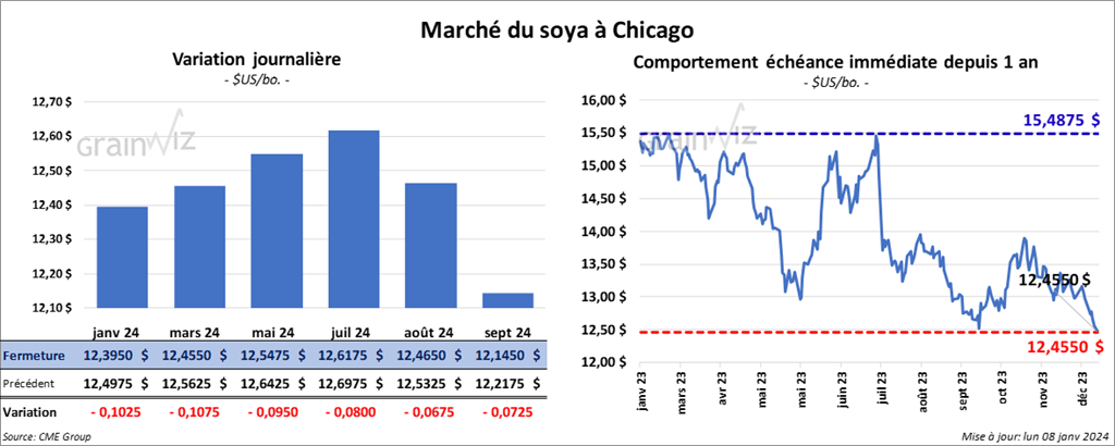 Le contrat de soya US janv. 24 a clôturé à 12,3950 $ (- 10 ¼ cents). Celui mars 24 a fermé à 12,4550 $ (- 10 ¾ cents). Celui mai 24 a terminé à 12,5475 $ (- 9 ½ cents). Quant au tourteau de soya US, le contrat janv. 24 a fini à 368,10 $/tonne (- 50 cents/tonne). Celui mars 24 a clôturé à 368,50 $/tonne (- 90 cents/tonne). Celui mai 24 a fermé à 369,10 $/tonne (- 1,60 $/tonne). Du côté de l’huile de soya US, le contrat janv. 24 a terminé à 47,44 $ (+ 27 points). Celui mars 24 a fini à 47,81 $ (+ 18 points).