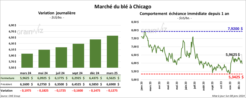À Chicago, le contrat de blé US mars 24 a clôturé à 5,9625 $ (- 19 ¾ cents). Celui mai 24 a fermé à 6,0925 $ (- 18 ¼ cents). Celui juil. 24 a terminé à 6,1775 $ (- 17 ¼ cents). À Kansas, le contrat de blé dur rouge mars 24 a fini à 6,1520 $ (- 12 ¾ cents). Celui mai 24 a clôturé à 6,1860 $ (- 13 cents). Celui juil. 24 a fermé à 6,2260 $ (- 12 ½ cents). À Minneapolis, le contrat de blé de printemps mars 24 a terminé à 7,0250 $ (- 9 ½ cents). Celui mai 24 a fini à 7,1175 $ (- 8 ½ cents). Celui juil. 24 a clôturé à 7,2125 $ (- 7 ¼ cents).
