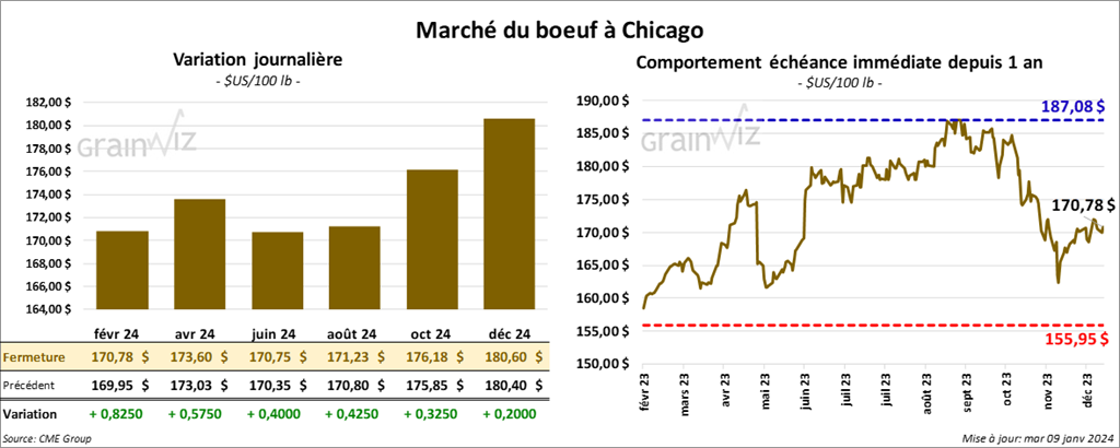 Le contrat de bœuf US févr. 24 a clôturé à 170,78 $ (+ 83 cents). Celui avr. 24 a fermé à 173,60 $ (+ 58 cents). Celui juin 24 a terminé à 170,75 $ (+ 40 cents). Quant au veau US bœuf US, le contrat janv. 24 a fini à 223,78 $ (- 10 cents). Celui mars 24 a clôturé à 224,88 $ (- 20 cents). Celui avr. 24 a fermé à 230,35 $ (+ 25 cents).