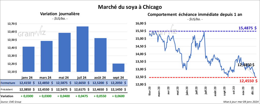 Le contrat de soya US janv. 24 a clôturé à 12,4150 $ (+ 3 cents). Celui mars 24 a fermé à 12,4850 $ (+ 3 cents). Celui mai 24 a terminé à 12,5875 $ (+ 4 cents). Quant au tourteau de soya US, le contrat janv. 24 a fini à 366,00 $/tonne (- 2,10 $/tonne). Celui mars 24 a clôturé à 367,60 $/tonne. (- 90 cents/tonne). Celui mai 24 a fermé à 368,20 $/tonne (- 90 cents/tonne). Du côté de l’huile de soya US, le contrat janv. 24 a terminé à 48,12 $ (+ 68 points). Celui mai 24 a fini à 48,81 $ (+ 63 points).