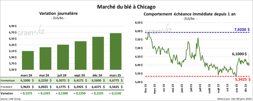 À Chicago, le contrat de blé mars 24 a clôturé à 6,1000 $ (+ 13 ¾ cents). Celui mai 24 a fermé à 6,2250 $ (+ 13 ¼ cents). Celui juil. 24 a terminé à 6,3075 $ (+ 13 cents). À Kansas, le contrat de blé dur rouge mars 24 a fini à 6,2700 $ (+ 11 ¾ cents). Celui mai 24 a clôturé à 6,3060 $ (+ 12 cents). Celui juil. 24 a fermé à 6,3420 $ (+ 11 ½ cents). À Minneapolis, le contrat de blé de printemps mars 24 a terminé à 7,0550 $ (+ 3 cents). Celui mai 24 a fini à 7,1475 $ (+ 3 cents). Celui juil. 24 a clôturé à 7,2375 $ (+ 2 ½ cents).