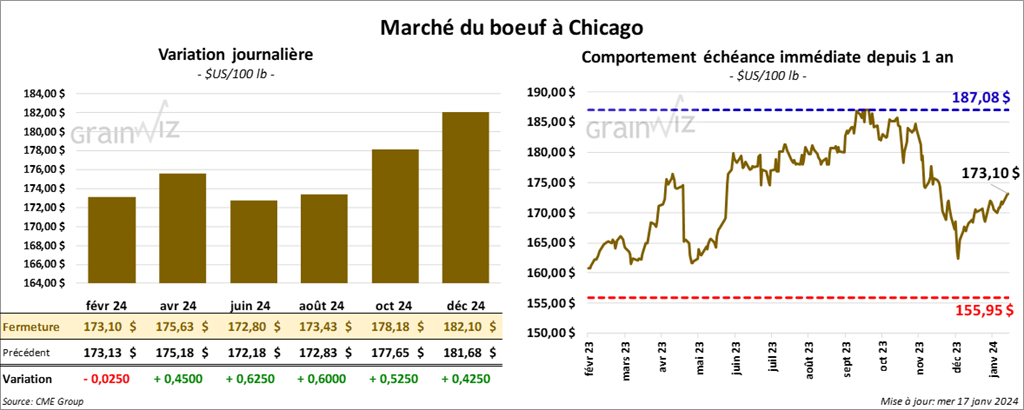Le contrat de bœuf US févr. 24 a clôturé à 173,10 $ (- 3 cents). Celui avr. 24 a fermé à 175,63 $ (+ 45 cents). Celui juin 24 a terminé à 172,80 $ (+ 63 cents). Quant au veau US, le contrat janv. 24 a fini à 228,43 $ (+ 88 cents). Celui mars 24 a clôturé à 229,78 $ (+ 95 cents). Celui avr. 24 a fermé à 235,20 $ (+ 93 cents).