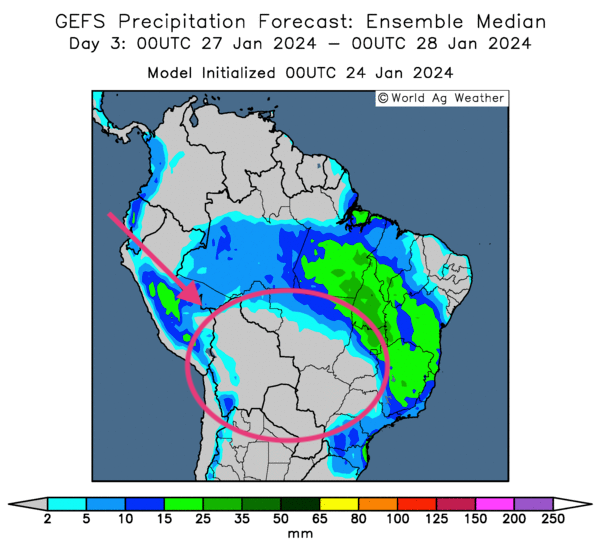 - Cette carte du Brésil, fournie par World Ag Weather et dessinée pour les 3 prochains jours, indique notamment que l’est et certaines parties du centre du Brésil pourraient recevoir des pluies plus abondantes. À noter que le centre-sud sera probablement épargné.